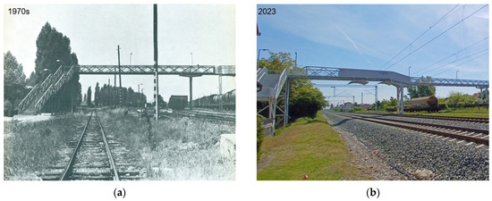 Pedestrian crossing over a railway corridor: (a) In the 1970s. Source: reference [21] (p. 107); and (b) Today. Photo by authors.