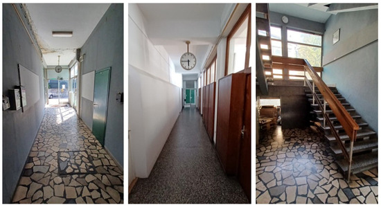 Second, personal informal interviews were also conducted on-site with different individuals (users). The factory complex is fenced, the property visit should be announced, and the entry should be registered. The porter at the main gate still guards the facilities. During the on-site visit, in the former meeting room in the administration building, we were introduced to the factory bankruptcy manager, whose duty is to take care of a collapsing complex. He permitted us to walk through the factory site and took us through the empty, but fully furnished administration building. The spirit of the past and the prosperity of the factory can be felt in the rich office’s interior, i.e., with corridors paved with terrazzo, wooden wall paneling, ceiling hanging clocks, and a modern two-legged staircase (Figure 13).