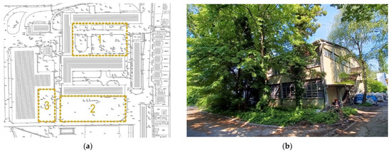 The existing high greenery—the spatial-functional backbone of the future settlement: (a) Valuable greenery—the three landscape units. Source: reference [82]; (b) High greenery in the inner courtyard. Photo by authors.