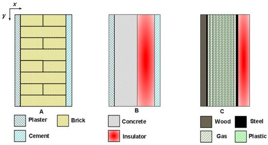 The first type of design involves the use of conventional materials, such as brick and concrete, depicted by Figure 1A,B. Figure 1A shows three layers: an internal plaster layer, a brick layer, and an external cement layer. The wall in Figure 1B comprises four layers: an internal plaster layer, a concrete layer, an insulating layer (EPS and glass wool), and an external cement layer.