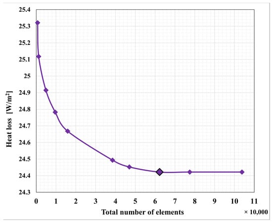In this research, the studied domain is meshed using the Ansys meshing application program. Undoubtedly, adding more computational cells can yield a more accurate result, but we must remember that this will come at a higher computational expense []. The results remain consistent beyond a certain number of cells, indicating that mesh independence has been achieved. To verify the independence of the results on the mesh density, ten meshes with an increasing total number of elements for wall C with one plastic layer are used. We calculate the heat loss based on the number of elements. Figure 2 illustrates that the heat loss does not change when the number of elements is increased beyond 63,000. Accordingly, we fixed an element size of 0.0008 m, such that the cells were square cuboids, and the total number of elements was 63,000.