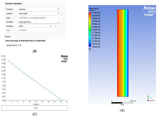 (A) The contour of the temperatures, (B) the average heat flux across the wall, and (C) the residual solution of the energy which is very small.