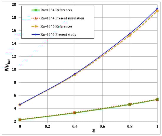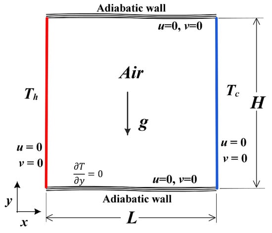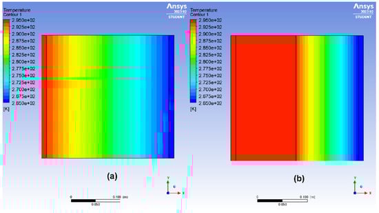 Heat transfer by convection and radiation validation proceeds by investigating a two-dimensional (2D) cavity consisting of two layers of metal separated by an air gap. To facilitate the comparison with the reference study [,] containing non-dimensional results, two Rayleigh numbers based on two characteristic dimensions of 0.021 m and 0.097 m are studied as shown in Figure 4 and Table 2 and Table 3. The properties of the air at the average temperature Tmean = 293.5 K are constant, as shown in Table 4, while the density varies according to the Boussinesq model.
