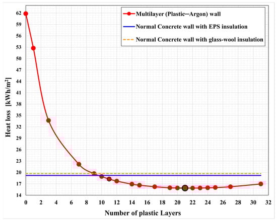 - We found that as the number of plastic layers increases, heat loss decreases due to reduced radiative heat transfer and limited convective movement of argon within the increasingly smaller spaces between layers. This trend continues until the wall comprises 21 layers of plastic. Beyond this point, heat loss begins to increase again as the conduction through the plastic layers becomes more significant than the insulating effect of the argon layers. In the case of 21 plastic layers, the initial investment is slightly larger than in the case of the standard walls. However, the heating load is much smaller, and this easily counterbalances the initial cost in 20 years.