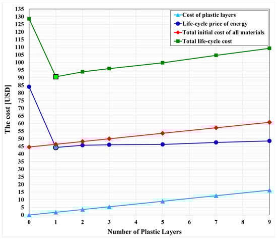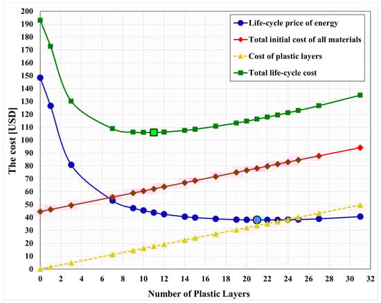 Economical quantities as a function of the number of plastic layers. The optimum numbers of plastic layers according to thermal and economic optimization are highlighted.