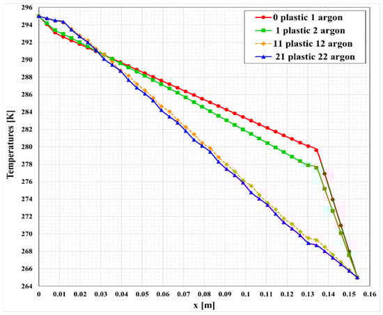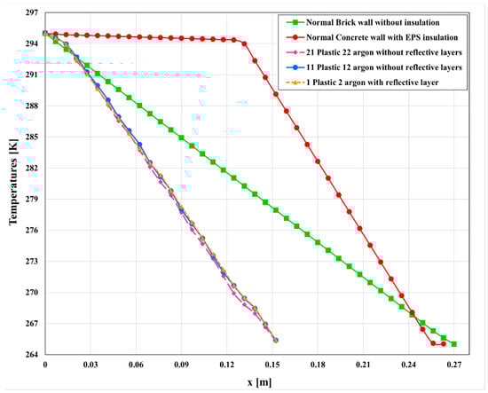 Now, we add aluminum foil to the plastic layers in addition to the inner surfaces of the steel layers to reflect the radiation, and in this case, we increase the price by adding the aluminum to the plastic. We note that the heat loss decreases because most of the radiation which goes across the argon layer is reflected due to the reflective layer. One can see from Figure 14 that after adding the foil aluminum layer, the optimum number of plastic layers is decreased to only one layer. The only negative effect of adding a layer of aluminum is that plastic with aluminum is harder to recycle. Figure 15 shows the temperature distribution contour in kelvin for the one plastic layer with a reflective layer compared to the one without a reflective layer. One can see that when the reflective layer is present, the middle layer is cooler, since radiative heat transfer is hindered. Moreover, the temperature gradients are smaller in this case in the wood and insulator layers. The comparison between the temperature distribution in the three multi-layer optimum walls compared to two types of reference walls is shown in Figure 16. One can see that the temperature in the normal brick wall has a significant decrease across the wall thickness due to the lack of insulation. However, in the normal concrete wall with EPS insulation, the temperature stays nearly constant at around 294 K, and after that, a sudden drop is caused by the presence of EPS insulation, significantly slowing down heat loss. In all multi-layer walls, we can see a slow but steady temperature drop, showing good insulation properties with a nearly steady gradient.
