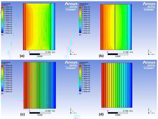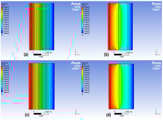 The temperature distribution contours in kelvin for the two types of thermally optimal multi-layer walls with different thickness of EPS insulation: (a,b) 0.03 m and (c,d) 0.04 m.