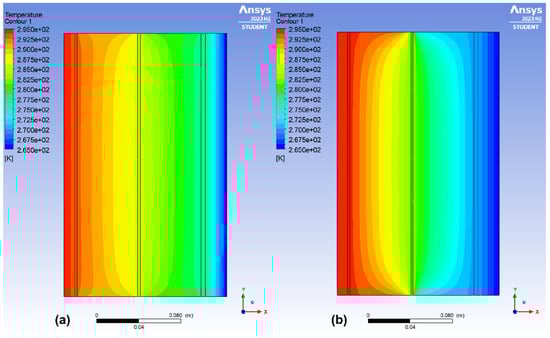 The temperature distribution contours in kelvin for two types of multi-layer walls: (a) one plastic layer without a reflective layer and (b) one plastic layer with a reflective layer.