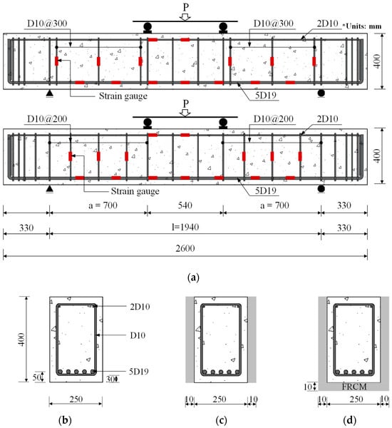 The experiments consisted of 12 medium-sized RC beams with a shear-span-to-effective-depth (a/d) ratio of 2.0, organized into two series, G1 and G2, with different spacings of shear reinforcement bars. The G1 and G2 series consisted of six specimens each, including one unstrengthened reference specimen and five FRCM-strengthened specimens. The two reference specimens were identical except for the transverse reinforcement spacing in the shear span; the material and geometric details of the beams are shown in Figure 1. The total span of the beam was 2600 mm, and the clear span between reaction force points was 1940 mm. The details of the specimens and materials are described in the following subsections.
