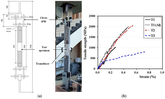 Figure 3 and Table 3 show the material properties of FRCM composites measured by a direct tensile test. The direct tensile test was conducted according to AC 434 [], considering the slip of the inorganic matrix and the textile grid. In addition, a test specimen with aluminum powder applied to the T1 grid was added to confirm the physical properties of the FRCM as a function of the surface treatment of the textile grid. The physical properties showed differences depending on the type of impregnant applied to the textile grid and whether the Al surface coating was applied or not.