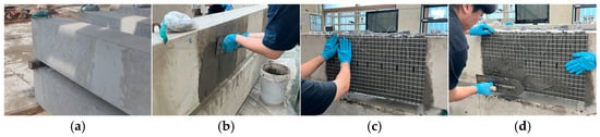 Strengthening methods. (a) Surface cleanup; (b) apply 1st matrix; (c) attaching textile grid; (d) apply 2nd matrix.