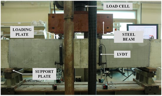 The strengthened specimen was subjected to a four-point load test in the form of a simple support beam using a Universal Material Testing Machine (UTM) with a capacity of 1000 kN, owned by the Smart Natural Space Research Center (Cheonan in republic of Republic of Korea), as shown in Figure 5. The distance between the load-bearing points was 540 mm; four LVDTs with a displacement capacity of 100 mm were installed at the bottom of the load-bearing points to measure the deflection (δ), and the average value of the deflection was measured. As shown in Figure 1, the strain of longitudinal and transverse reinforcement in the experimental section was measured by attaching strain gauges. The strain of the FRCM was measured by attaching strain gauges directly to the transversely placed fibers of the textile grid between the matrix.