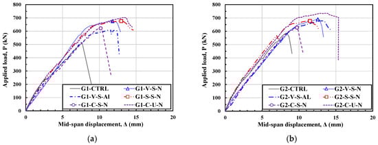 Applied load (P) vs. mid-span displacement (Δ) curves. (a) G1 series; (b) G2 series.