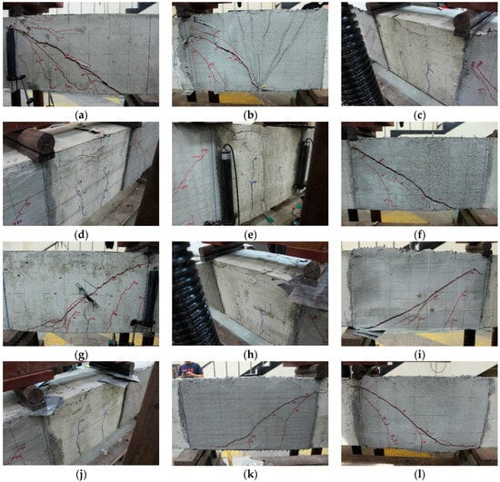 Crack pattern and failure mode of beam. (a) G1-CTRL; (b) G1-V-S-AL; (c) G1-C-U-N; (d) G1-S-S-N; (e) G1-V-S-N; (f) G1-C-S-N; (g) G2-CTRL; (h) G2-V-S-AL; (i) G2-C-U-N; (j) G2-S-S-N; (k) G2-V-S-N; (l) G2-C-S-N.