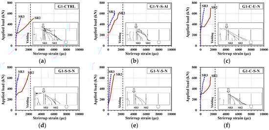 All specimens showed that the strain in the transverse reinforcement increased after the diagonal crack appeared in the web concrete inside the shear span of the beam, contributing to the shear force. For the G1-CTRL specimen, shown in Figure 8a, the strain in SR2 at the location of the main shear crack penetration reached the yield strain, and the stirrup yielded. SR3, which is close to the tension point, also contributed to the shear. For the G2-CTRL specimen, the shear crack penetrated at SL2 and SL3, but the transverse reinforcement at SL3 was the largest contribution factor to the shear. For this reason, the shear reinforcement ratio (ρw) of the G2-CTRL specimen increased by 50%, but the increase in the beam’s strength was low at 14%.