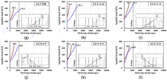 Applied load vs. stirrup strain for all beams. (a) G1-CTRL; (b) G1-V-S-AL; (c) G1-C-U-N; (d) G1-S-S-N; (e) G1-V-S-N; (f) G1-C-S-N; (g) G2-CTRL; (h) G2-V-S-AL; (i) G2-C-U-N; (j) G2-S-S-N; (k) G2-V-S-N; (l) G2-C-S-N.