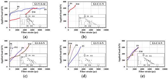 As shown in Figure 9c–e, the strain distribution of the textile grid at F10, where the diagonal crack passed through at the applied load before the yielding of the reinforcement in the G1 series, varied depending on the fiber type. The G1-S-S-N specimen with the T2 grid exhibited the largest strain, while the G1-C-S-N specimen with the T3 grid exhibited the smallest strain. This is believed to be due to the difference in physical performance based on the type of fiber impregnation (Figure 3b, Table 3) [].