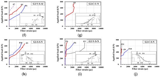 Applied load vs. fiber strain for strengthened beams. (a) G1-V-S-AL; (b) G1-C-U-N; (c) G1-S-S-N; (d) G1-V-S-N; (e) G1-C-S-N; (f) G2-V-S-AL; (g) G2-C-U-N; (h) G2-S-S-N; (i) G2-V-S-N; (j) G2-C-S-N.