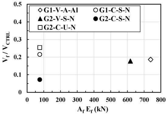 Figure 10 shows the ratio of reinforcement performance (Vf/VCTRL) to the axial stiffness (AfEf) of the shear fractured specimen. AfEf was calculated based on the direct tensile test results of FRCM composites, as shown in Table 3.