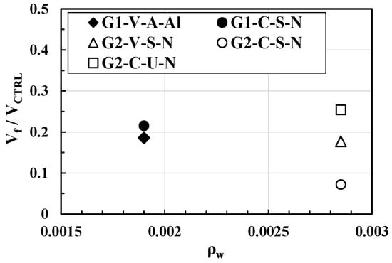 Previous studies have shown that the contribution of FRCMs to the overall shear strength of FRCM-reinforced beams is influenced by the shear reinforcement ratio (ρw). The shear strength contribution of FRCMs is expected to be lower for beams with higher ρw. Figure 11 shows the ratio of reinforcement performance to the shear reinforcement ratio for the shear-failed specimens. Although it is difficult to draw conclusions due to the small number of shear failure specimens, the reinforcement performance ratio of the G2-C-S-N specimens is lower than that of the G1-C-S-N specimens. This result is consistent with the comparison of the shear reinforcement strain (εs,max) at the maximum shear capacity (Vmax) shown in Table 5, which is likely to reflect the effect of the interaction between the shear reinforcement and the FRCM described in Section 4.1. However, this effect needs to be further investigated due to the small number of specimens with shear failure.