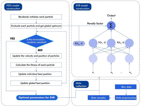 36]. To address this limitation, this study introduces Particle Swarm Optimization (PSO) to adjust SVR’s key parameters [