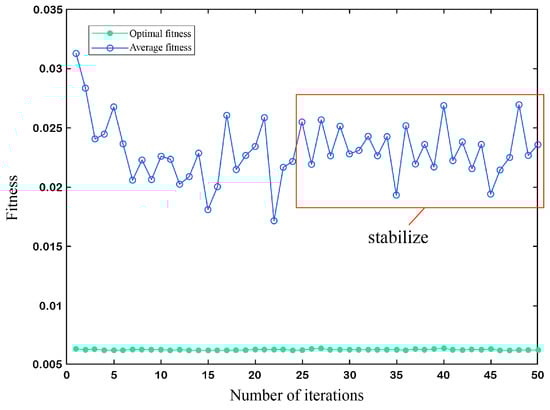 The data were imported into the file M based on MATLAB scripts, and the PSO algorithm tuning SVR was introduced to train and test the model again. The optimal penalty factor and kernel function parameters were found by adjusting the parameters of PSO algorithm. The population size of PSO was set to 50 and the maximum number of iterations was set to 50; both individual cognitive factor C1 and social factor C2 were set to 2. After several training sessions, the final root mean square error (RMSE = 0.14658) gradually converged and the optimized parameter was set as follows: C = 6.1409, γ = 0.01. The fitness curve (