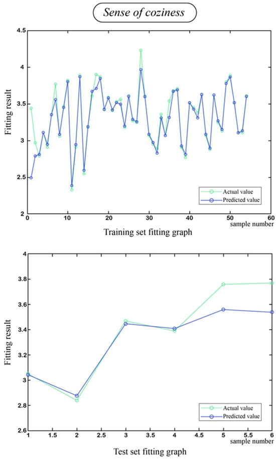 At this stage, the mathematical model of PSO-SVR was used for programming calculation, thus obtaining the set point and mapping function of optimization parameters. The collected sample data were divided into a training set and a test set proportionally, of which 90% (54 samples in total) were used to train the model and the remaining 10% (6 samples in total) were used to verify the model’s predictive performance. Firstly, the key design features of the sample were taken as input data, and the adjective of “sense of coziness” in the Likert score was used as the output value. The RBF was used to map the input value to the high-dimensional feature space; the PSO algorithm was introduced to search and optimize the key parameters of SVR globally, and a model was constructed in the feature space. Meanwhile, the coefficient of determination (R