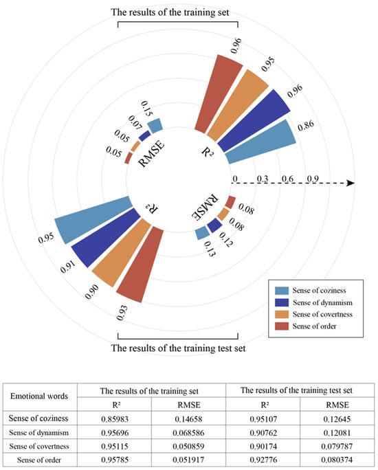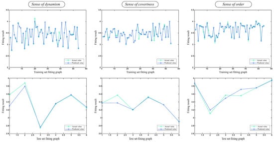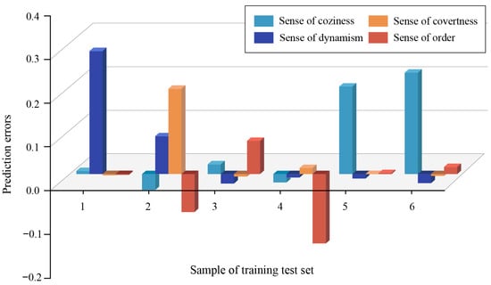 Figure 9 shows the prediction errors between the predicted and actual values on the test set, with the overall error range between −0.2 and 0.4. The figure illustrates that the model performs reliably on most samples, with a high prediction accuracy. However, there is still room for improvement in some samples (e.g., samples 1 and 6), and future optimization efforts could focus on handling these outliers. In addition, the experimental results show that the constructed PSO-SVR model has high prediction accuracy and can be used to establish the mapping relationship between users’ Kansei semantics and OMS design elements. Similarly, we can compare the prediction results of the training sets for the remaining three emotional descriptors, “sense of dynamism”, “sense of covertness” and “sense of order” (