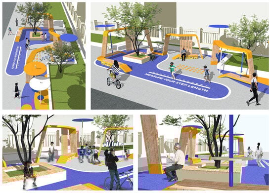 Before deriving the design, we held in-depth discussions with five experts from fields related to spatial design regarding the optimal design feature matching results provided by the algorithm, and explored how these results could be applied in design scenarios. Therefore, the high consistency between the feature weights and actual design priorities is reflected in the following aspects: Firstly, the high priority of facade material in the design reflects its significant role in enhancing the space’s esthetics, comfort, and safety. To enhance comfort, the optimal design group used wood material (C5-1); the combination of this with colors (yellow and blue) and the use of curved shapes contributed to enhancing the space’s dynamism. The seating orientation design, by promoting social interaction, optimized users’ experience within the space. A seat orientation (C10-7), with an open surrounding layout, was chosen to further enhance the overall functionality of the design. For the ground paving design, pavement material (C11-10) with bright colors was selected to ensure both durability and comfort. Seating serves a supplementary role in the actual design, with an emphasis on comfort and functionality. C3-1 was used for seating; it is highly ergonomic, and a simple, straightforward seat shape was chosen. To create a sense of covertness, the design connected the top and facade with a consistent design language, forming a unified visual effect. Finally, by emphasizing design order and regularity, the overall integrity and coherence of the design were ensured.