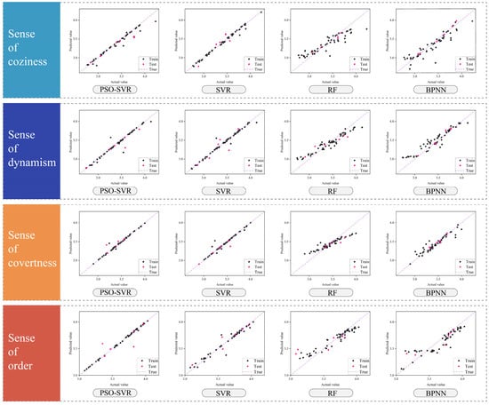 Figure 13). In the scatter plots, the results of the training and test sets for all four models under different emotional data were presented with linear fits. Both RF and BPNN exhibited poor performance on the training and test sets across all four emotional datasets. Although SVR performed well on the training set, it showed inferior performance on the test set compared to PSO-SVR. Therefore, PSO-SVR outperformed the other three models on both the training and test sets. This indicates that SVR, by optimizing model parameters, improves its handling of nonlinear data, allowing PSO-SVR to excel in terms of both accuracy and generalization ability. Its computational efficiency and ease of implementation make it a more ideal choice.