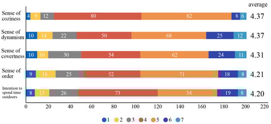 Figure 12 met the emotional intentions of comfort, dynamism, covertness, and orderliness, as well as whether it could influence their intention to increase outdoor activity duration. A 7-point Likert scale was used, with 1 indicating “strongly disagree” and 7 indicating “strongly agree”. According to the survey results, the scores for sense of coziness (4.37), sense of dynamism (4.37), sense of covertness (4.31), and sense of order (4.21). were all above the median score of 4, indicating that the optimization of these emotional descriptors effectively enhanced users’ spatial experience and increased their intention to engage in longer outdoor activities (4.2). These results suggest that optimizing OMS design can significantly improve users’ emotional satisfaction and promote longer outdoor activities. The specific data are summarized in