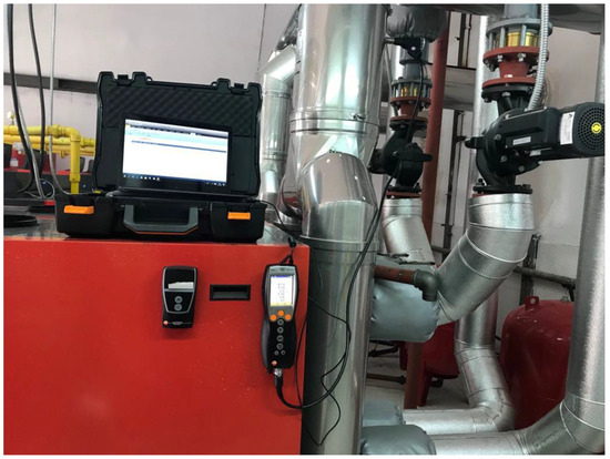 The terminal building is heated with natural gas condensing boilers. Flue gas analyses of these boilers were conducted at regular intervals using a Testo 330-2 LL flue gas analyzer (Testo SE & Co. KGaA, Baden-Württemberg, Germany), as shown in Figure 1.