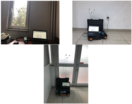 For thermal calculations, Thermal Transmittance (U-value) measurements of the terminal building envelope were conducted using a Testo 435-4 device (Testo SE & Co. KGaA, Baden-Württemberg, Germany). The measured U-values were validated by comparing them with the values calculated from the surface components detailed in the terminal building’s architectural project. The measurement setup is illustrated in Figure 2. To ensure accuracy and precision, multiple measurements were taken from various regions of the terminal building.