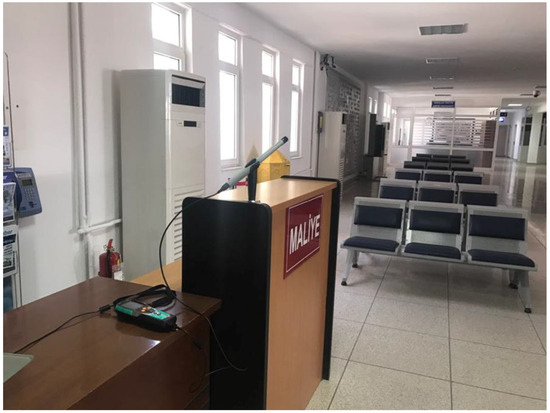 Indoor air parameters, including temperature, humidity, and CO2, were measured at regular intervals using the Testo 435-4 multifunctional measuring device (Testo SE & Co. KGaA, Baden-Württemberg, Germany). IEQ and heating system performance in the airport terminal building were assessed and compared to relevant standards. The IAQ measurement setup is illustrated in the figure, where temperature, humidity, and CO2 levels were monitored every second with high accuracy. The measurement location and setup are depicted in Figure 3. The IAQ assessment focused on parameters such as CO2 levels, temperature, and humidity, referencing acceptable thresholds outlined in the ASHRAE Standard [31]. These standards specify indoor CO2 limits (below 1000 ppm) and acceptable temperature ranges for various zones within airport terminals. To evaluate energy consumption and potential savings, the study employed methodologies from TS 825 for calculating heating energy requirements and economic payback periods.