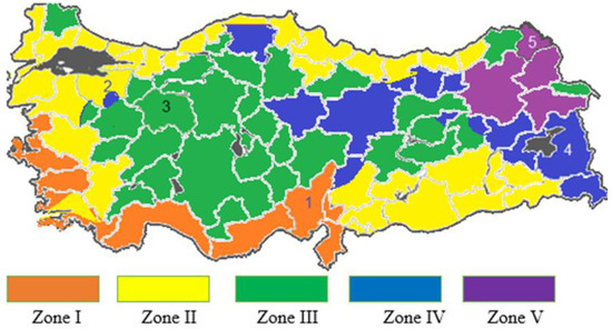 The parameters and methodologies selected for this study were guided by international standards, national regulations, and established engineering principles to ensure accuracy, relevance, and consistency. Thermal performance analysis evaluated key parameters such as thermal transmittance (U-values), heat losses, and thermal bridges, based on the TS 825 standard. This standard outlines thermal insulation rules for buildings and specifies maximum allowable U-values for various building components across different climate zones. To evaluate energy consumption and potential savings, the study employed TS 825 methodologies for calculating heating energy requirements and economic payback periods. Heat losses in buildings primarily occur through exterior wall surfaces. Using materials with low thermal conductivity in exterior wall components reduces heat losses and gains, enabling energy savings. Solar energy gains and internal heat gains through window surfaces were incorporated into the calculations. The calculation method in this study followed the TS 825 standard, “Rules of Thermal Insulation in Buildings.” This standard calculates the net heating energy required for buildings serving various purposes. According to the TS 825 standard, Turkey is divided into five distinct climate zones (Figure 4) [34].