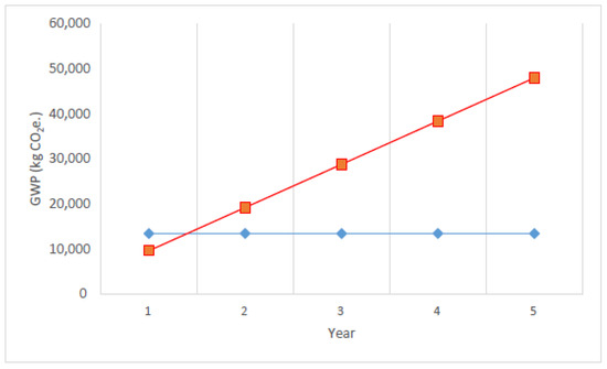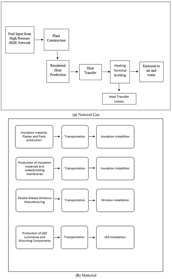 Environmental analyses in this study followed Life Cycle Assessment (LCA) principles outlined in ISO 14040, evaluating all environmental aspects of a process from raw material extraction to waste disposal (“cradle to grave”). The life cycle stages encompass raw material acquisition, processing, product or service conversion, transportation, distribution, consumer use, and final disposal or recycling [42,43]. Global Warming Potential (GWP) is calculated according to IPCC 100a and expressed in kg CO2eq. The updated version, IPCC 2013, allows for calculating climate change effects over time frames of 20, 100, and 500 years. This study calculated GWP impacts over a 100-year time frame. Environmental impacts were derived from the ecoinvent 3 database integrated into SimaPro 9.0.0.35 software. The functional units in the LCA study were defined as follows: 1 kWh of heat production from natural gas, 1 m2 of insulation, 1 m2 of glass surface for windows, and 1 lumen or 1 lux, over a lifespan of 50,000 h. The system boundaries for the LCA study are illustrated in Figure 5a,b. The study identifies and interprets environmental impacts that can be mitigated through energy savings. The environmental payback period (EPP) is defined as the ratio of the environmental impacts of all processes within the system boundaries to the environmental benefits achieved from one year of energy savings.