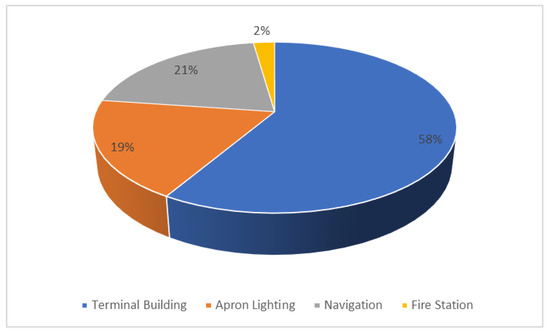 As illustrated in Figure 6, 58% of the total energy consumption was attributed to the terminal building. Apron lighting contributed 19% to the total energy consumption, while radio navigation systems accounted for 21%. The fire station exhibited the lowest energy consumption, accounting for only 2% of the total.