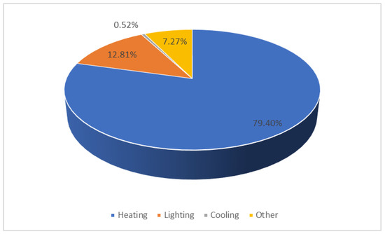 where H is the specific heat loss of the building, is the annual heating energy need, is the monthly heating energy need, is the monthly mean internal temperature, is the monthly mean external temperature, is the monthly mean gain use factor, is the monthly mean internal heat gains, is the monthly mean solar energy gains, and t is the heating period. The specific heat loss of the building can be calculated by the equation mentioned below: