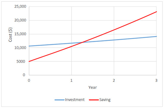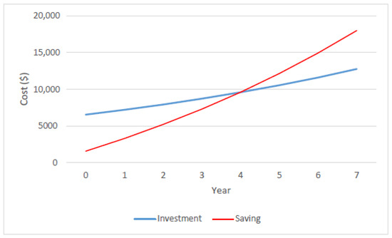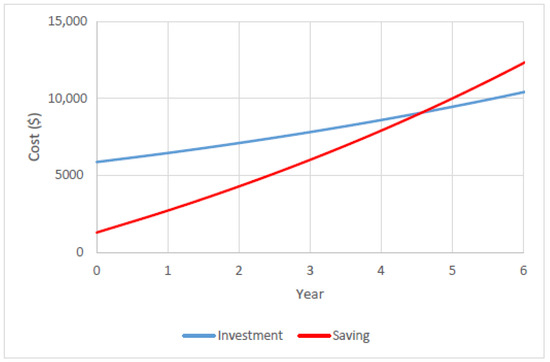 The curve showing the savings provided by insulation and renovation is obtained by calculating the monetary value of the heat savings provided by the changes made to the structure and calculated according to TS 825 cumulatively for the following years, taking into account the time-dependent value of money. The monetary value of the savings provided is calculated using Equation (16) [34]. In the PP calculations made with the TS 825 standard, the effective interest rate (ief) is assumed to be 10%. Natural gas and electricity prices were chosen as 0.32 USD/m3 and 0.134 USD/kWh, respectively, based on the sales tariffs of distribution companies in Türkiye.