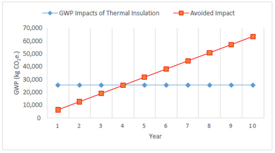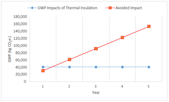 In the inventory analysis, foreground data were gathered from literature, technical reports, and expert opinions regarding the properties and quantities of materials such as the insulation, plaster, paint, and waterproofing membranes to be used. Background data for the study were sourced from the ecoinvent database, integrated within the SimaPro software. The energy used during assembly has been neglected, and it has been assumed that the thermal insulation materials, plaster, paint, membrane, windows, and LED are transported 250 km by truck from the production facility. The environmental payback period (EPP) is the ratio of the environmental impacts of all processes within the system boundaries shown in the figure to the environmental benefits resulting from one year of energy savings. It is calculated using Equation (33).