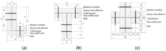 The specific size of the composite column. (a) Section of L-shaped bamboo–steel composite special-shaped column; (b) Section of T-shaped bamboo–steel composite special-shaped column; (c) Section of cross-shaped bamboo–steel composite special-shaped column.