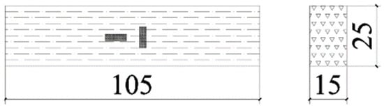 The compression specimens of bamboo scrimber along the grain in this test are designed according to the “Standard for Methods Testing of Timber Structures” (GB/T50329-2012) [21] and “Bamboo Scrimber” (GB/T40247-2021) [22]. The specimens have the dimensions of 15 mm × 25 mm × 105 mm, with the reference number KY1~KY6, and there are six specimens in total. The section size of the specimen is shown in Figure 2. The WAW-300 electro-hydraulic servo universal testing machine is used for carrying out the loading test, and displacement loading is adopted. The initial load is 5% of the failure load, and the specimen is uniformly loaded at the loading speed of 4.5 mm/min; the loading time is stipulated in 30–90 s. Before loading, the specimen was placed in a constant temperature environment and dried, the force sensor was placed vertically at the bottom of the testing machine, and the specimen was placed on the sensor. The axial line of the specimen coincided with the center of the reaction frame, and the displacement was loaded at a uniform speed until the specimen was damaged.
