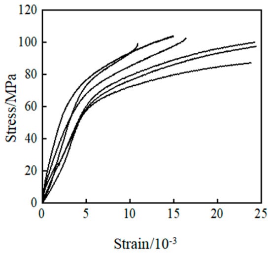 For the compression specimen of bamboo scrimber along the grain, there are mainly two failure modes of creasing failure and “Y”-shaped failure. The failures of the compression specimens are shown in Figure 3. In the elastic stage, the stress increases uniformly with the strain, and it presents a linear increase integrally; when entering the elastic-plastic stage, the stress increases slowly with the strain, with a gentler slope for the curve; and in the plastic stage, the slope remains basically unchanged, the strain changes quickly, and finally the specimen fails. The stress–strain curve of the compression specimen is as shown in Figure 4.