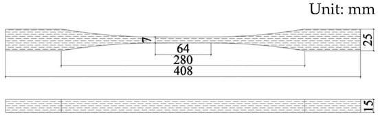 The tensile specimens of bamboo scrimber along the grain in this test are designed according to “Bamboo Scrimber” (GB/T40247-2021) [22] and the “Method of Testing in Tensile Strength Parallel to Grain of Wood” (GB/T1938-2009) [23]. The specimens have the dimensions of 15 mm × 7 mm. Six tensile specimens of bamboo scrimber along the grain are processed in total, with the reference number KL1~KL6, and the size of the specimen is shown in Figure 5. The WAW-300 electro-hydraulic servo universal testing machine is used for carrying out the loading test, and displacement loading is adopted. The specimen is constantly loaded at the loading speed of 3 mm/min. The loading time is stipulated to be from 30 to 90 s. Before loading, Caffert glue is applied to the strain gauge on the specimen for protection. After the specimen is placed and dried in a constant temperature environment, it is vertically fixed in the middle of the chuck of the testing machine. The axial line of the specimen coincides with the center of the upper and lower chuck, and then the test is completed.