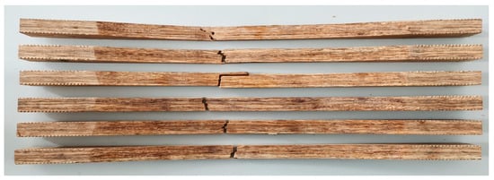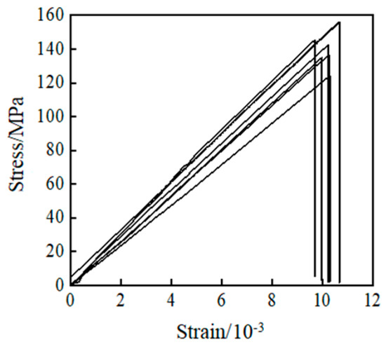 For the tensile specimens of bamboo scrimber along the grain, there are mainly three failure modes of diagonal-crack failure, V-shaped failure, and Z-shaped failure. The failures of the tensile specimens are shown in Figure 6. The test of the tensile specimen is divided into two stages. In the linear stage, the curve slope is constant, and the strain increases uniformly with the increase of stress; when the specimen reaches the maximum load, the specimen rapidly fails, and the load drops rapidly. The stress–strain curve of the tensile specimen is shown in Figure 7.