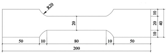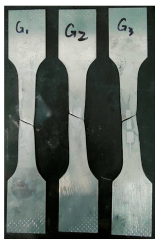 The specimens used in the test are designed and processed according to the “Technical Code of Cold-formed Thin-Wall Steel Structures” (GB 50018-2002) [24], and three groups of tensile specimens are made, with a thickness of 1.0 mm. The tensile specimen is shown in Figure 8. The WDW-100 electro-hydraulic servo universal testing machine is used to complete the tensile test. The specimens, numbered G1, G2, and G3, are constantly loaded with force at the loading rate of 120 N/s until failed, and the loading time is ensured to be about 60 s. The failure state of the specimens is shown in Figure 9.