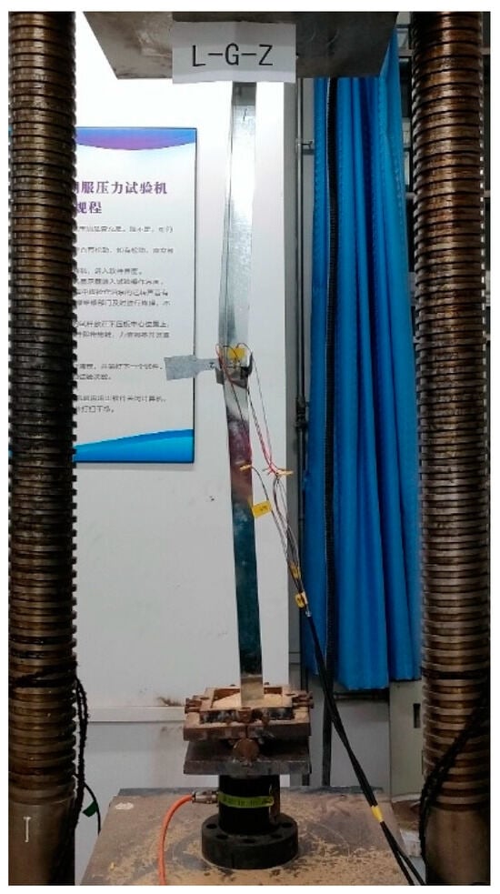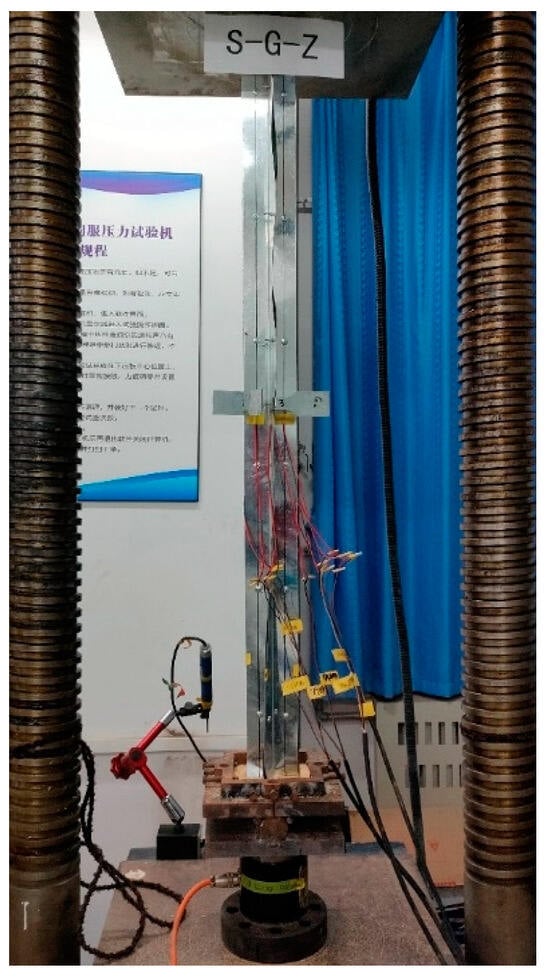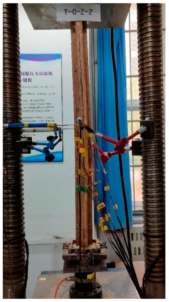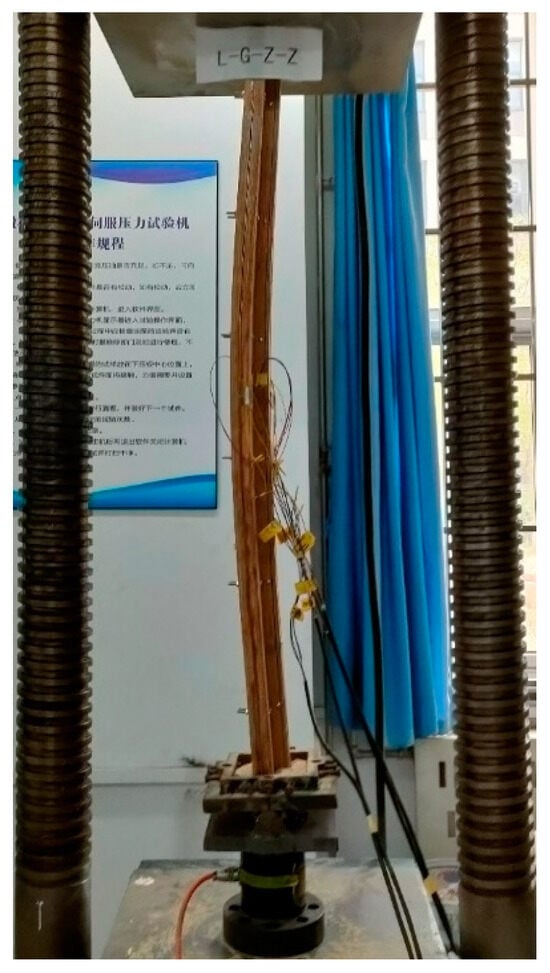 The specimen is subjected to the axial compression test on a 200 t electro-hydraulic servo pressure testing machine. The length of the specimen is 1200 mm. The upper bearing plate of the testing machine is a hinged support, and the lower bottom plate is provided with a self-made hinged support. The test adopts displacement control, and the loading rate is 0.005 mm/s. When loading to the ultimate load, continue to load, and stop when the load drops to 50% of the ultimate load. In order to better measure the stress–strain of the specimen, the test will be arranged in the strain gauge at the column height of 1/2 in the external reorganization of the bamboo, and the internal cold-formed thin-walled steel sections will be pasted on the same position of the strain gauge; at the same time, in the external reorganization of the bamboo strain gauge on the same height of the arrangement of the displacement meter, to prevent contact with the strain gauge resulting in inaccurate measurement data, will be placed in the displacement meter pointer on the side of the strain gauge. Displacement and strain are collected with the Gantner data acquisition instrument. The layout of the cross-shaped strain gauges and the displacement gauges are as shown in Figure 10.