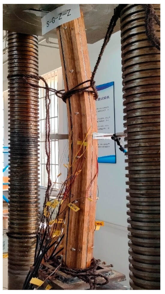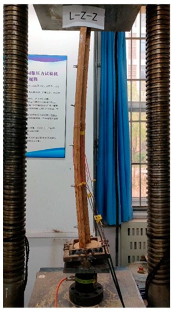 The specimen L-Z-Z is an L-shaped bamboo scrimber column. When it is loaded to about 79 kN, the specimen is observed to start bending, and a slight sound of adhesive cracking is heard. When the specimen is continuously loaded to 81 kN, it reaches the ultimate bearing capacity, obvious bending occurs, and the bending instability failure finally occurs. The failure of the specimen is shown in Figure 12.