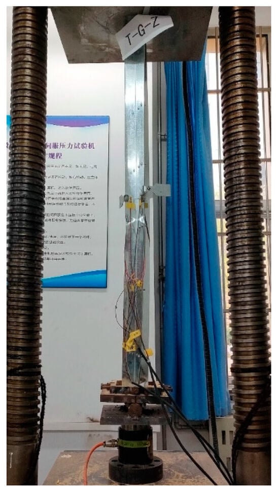 The specimen T-G-Z is a T-shaped steel column. When the specimen is loaded to about 4.6 kN, the flange on one side of the specimen begins to bend, and a gap appears at the middle-lower end of the two L-shaped steels. When the specimen is continuously loaded to about 8 kN, the flange on the other side of the specimen begins to bend, and the web bends towards the flange direction. When the load reaches about 14 kN, the specimen reaches the ultimate bearing capacity, and distortional buckling occurs in the middle part on one side of the flange. The final failure mode of the specimen involves distortional buckling and flexural-torsional buckling, and the failure of the specimen is shown in Figure 14.