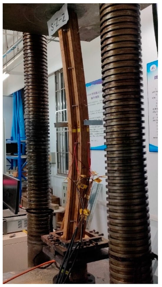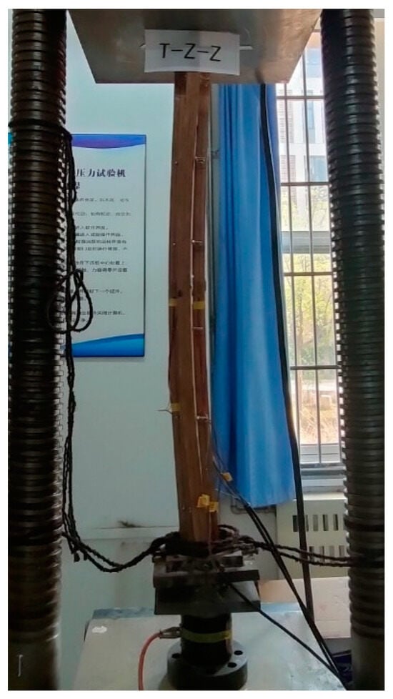 The specimen T-Z-Z is a T-shaped bamboo scrimber column, and there is no phenomenon in the early loading stage. When the specimen is loaded to about 139 kN, the specimen makes a slight sound of glue failure and begins to bend integrally. When the specimen is continuously loaded to about 171 kN, the specimen reaches the ultimate bearing capacity, the overall bending effect is obvious, and the specimen is subjected to overall bending failure. The failure of the specimen is shown in Figure 15.